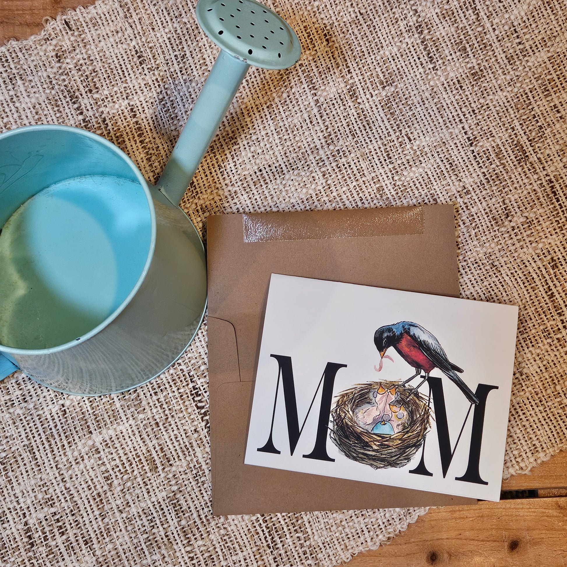 Perched at the edge of her carefully woven nest, a mama robin leans in to feed her hungry chicks - an everyday act of care that holds extraordinary meaning. In this tender illustration, the nest forms the O in the word MOM, quietly weaving sentiment and symbolism into the scene. It’s a gentle tribute to the patience, devotion, and love that define motherhood. This Mother's Day greeting card features an original illustration of a Mama Robin and her nest of hatchlings, hand-drawn in pen and ink and finished with watercolor. Designed to feel warm, thoughtful, and quietly delightful, it's perfect for Mother's Day gifting.